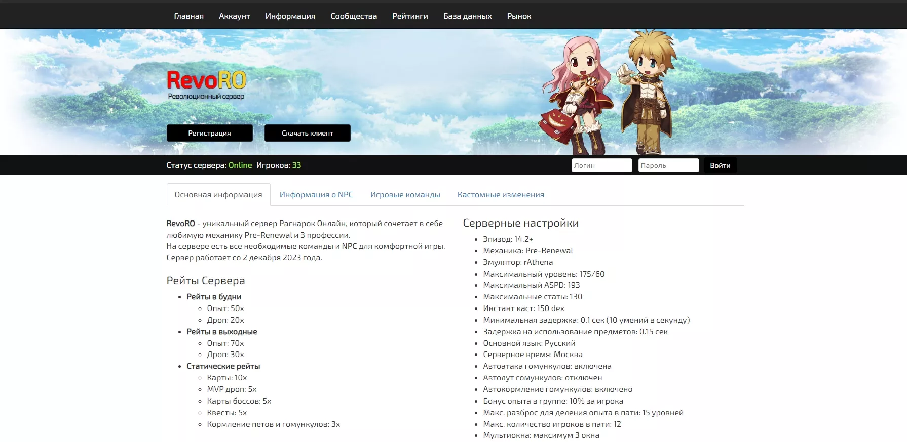 RevoRO is a unique combination of classic Pre-Renewal mechanics and three new professions in the world of Ragnarok Online. Our server, launched on December 2, 2023, will provide you with everything you need for a comfortable game.